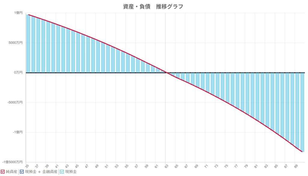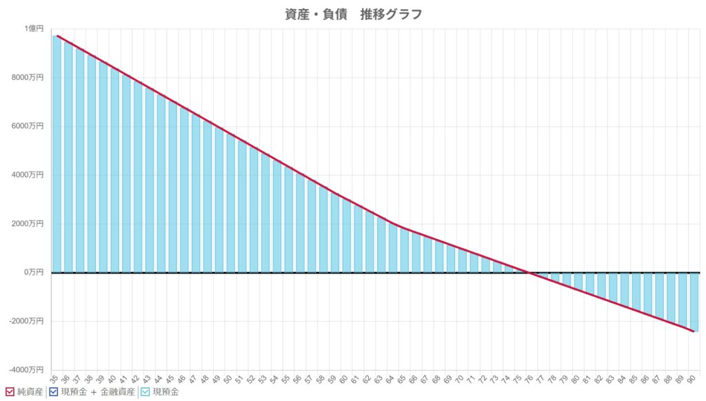 インフレ率0%で、現金1億円保有、月の生活費を20万円とした場合の90歳までのキャッシュフローと資産推移
