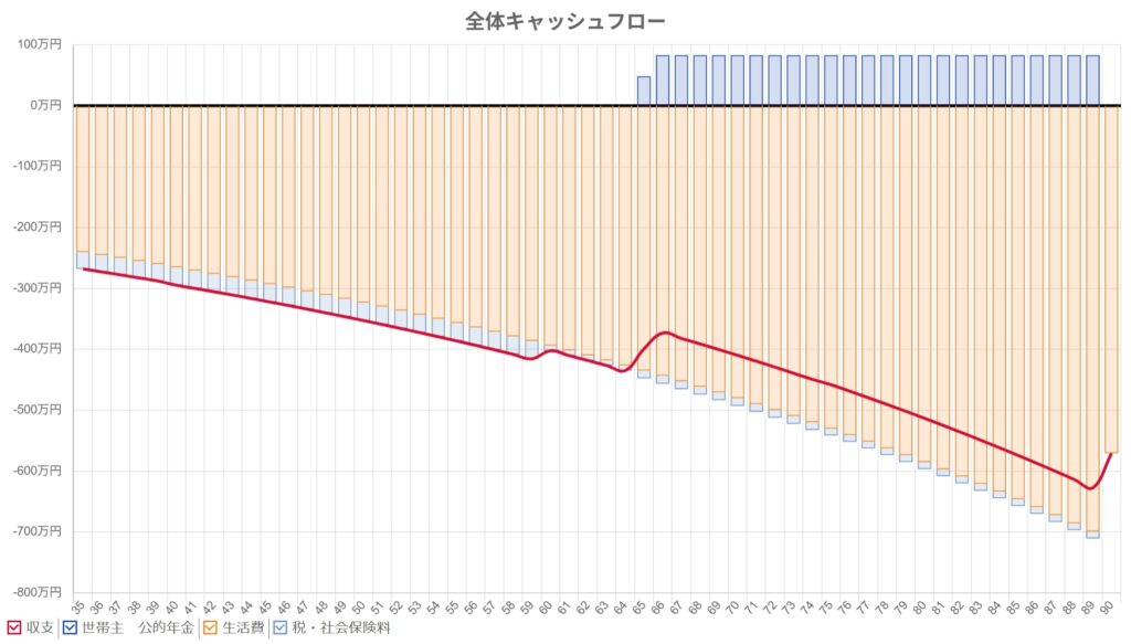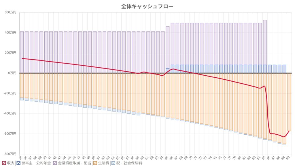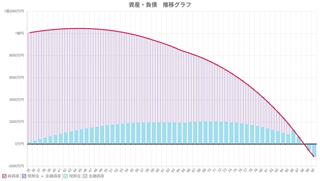 インフレ率が2%ですが、資産を投資しながら取り崩しをしているため、前半は終始がプラスで推移しています。後半も利息収入を得ながら生活することにより、88歳まで生活できることが分かりますね。