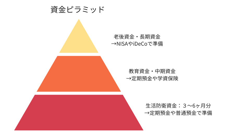 頂点(老後資金・長期資金): 長期運用(20年以上)が前提となるため、NISAやiDeCoといった制度を活用し、積極的に株式や投資信託といったリスク資産で運用比率を高めるべき資金です。